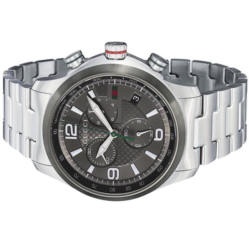 Since 1921, the house of Gucci has been at the forefront of fashion, manufacturing handbags, shoes, sneakers, sunglasses, wallets, belts, scarves, jewelry, and fashionable timepieces. This timepiece features a grey dial with chronograph functions.